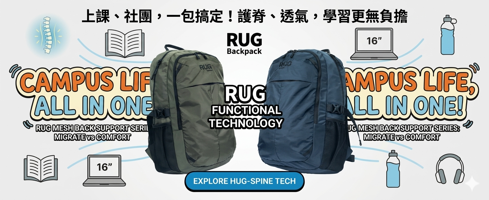 RUG Peace 20L 戶外校園兩用背包|多功能大容量 附防水套 透氣舒適背負 灰白色